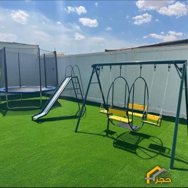 5غرف نوم -2منهم ماستر/غرفتين كل غرفه فيهم فيها 3 سراير/غرفه عاملات/مطبخ متكامل/دوانيه مع خدماتها وباب داخلي وخارجي/حمام سباحه كبير مع تدفئه+حمام سباحه اطفال/جلسه خارجيه للحديقه/ نطاطيه اطفال حجم كبير/مكينه ايسكريم(لكن ليس من ضمن الايجار)